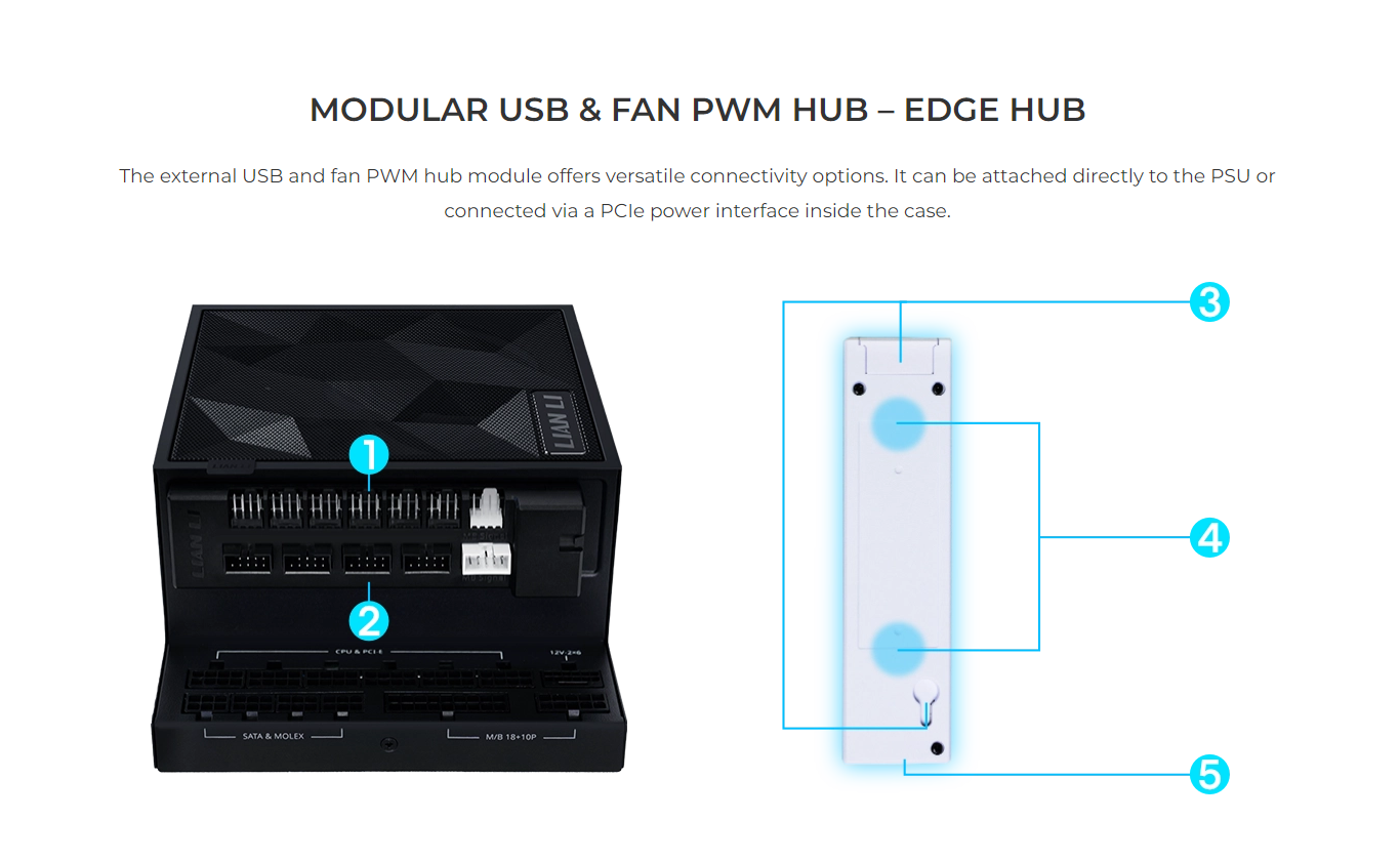 Introducing the world’s first PSU with a detachable USB and PWM fan hub that also functions independently, and that features a removable magnetic dust filter. This unique form factor reorients the connectors outward, simplifying cable management and ensuring a clean, organized build.