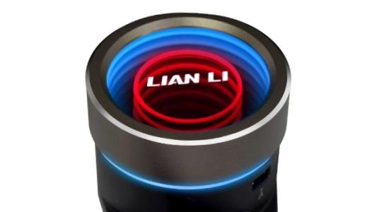 An aluminum housing cap with duo infinity mirror rings and a Lian Li logo at the center.