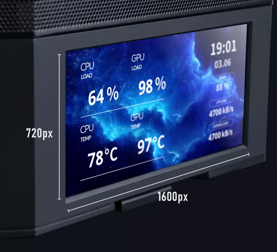 - Вграден 6-инчов LCD екран – показва системни параметри в реално време и може да се използва като вторичен дисплей.