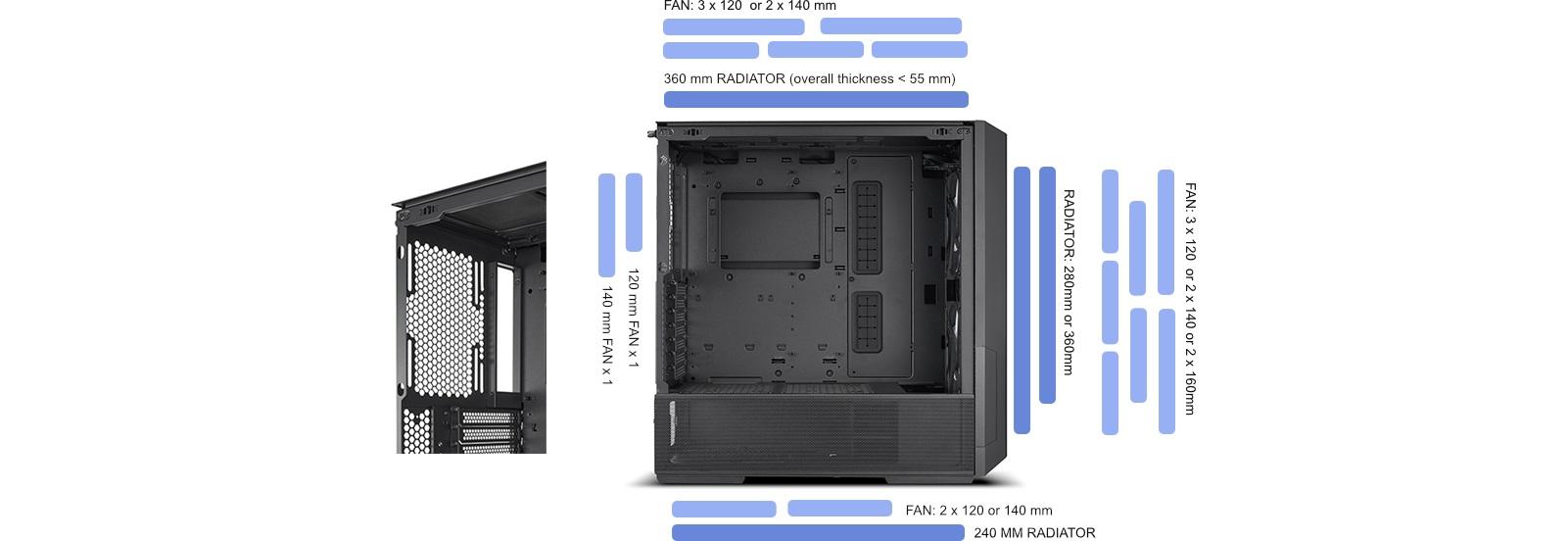 | RADIATOR SUPPORT | Front: 360 / 280 / 240mm Top: 360 / 280 / 240mm Bottom: 240mm |
