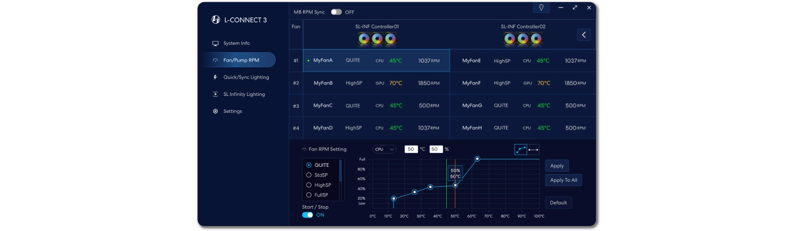 Unique to the SL-Infinity fans, L-Connect 3 features a Start/ Stop mode to completely stop the