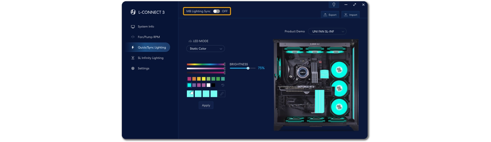Note: Only available when connecting via a UNI FAN SL-INFINITY controller, controller is sold
