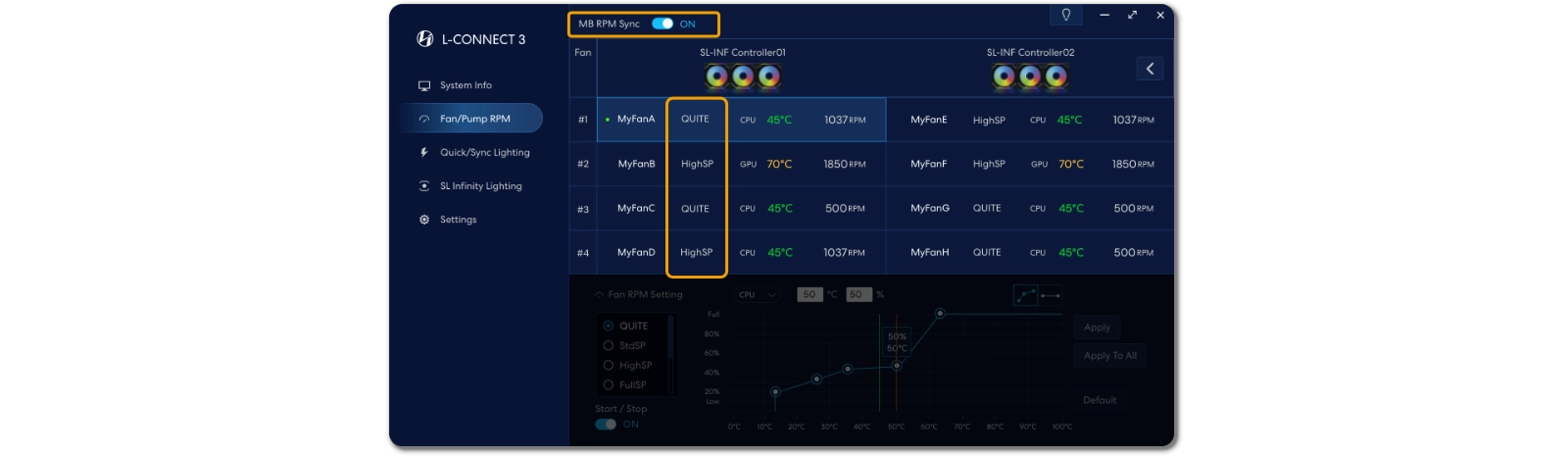 Unique to the SL-Infinity fans, L-Connect 3 features a Start/ Stop mode to completely stop the