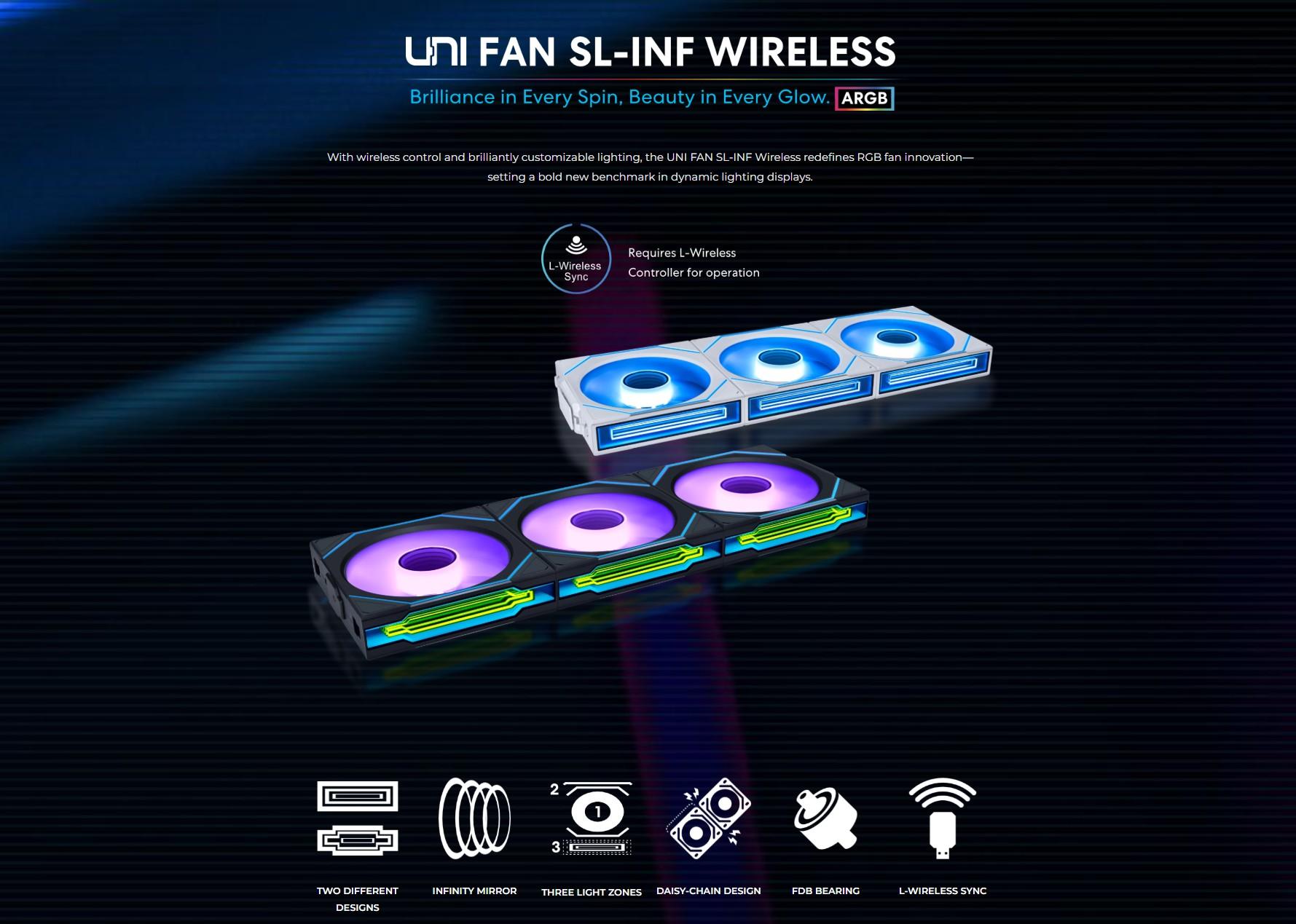 UNI FAN SL-INF Wireless is available in two color options – black and white– and supports both standard and reverse airflow orientations to suit any build style or cooling setup.