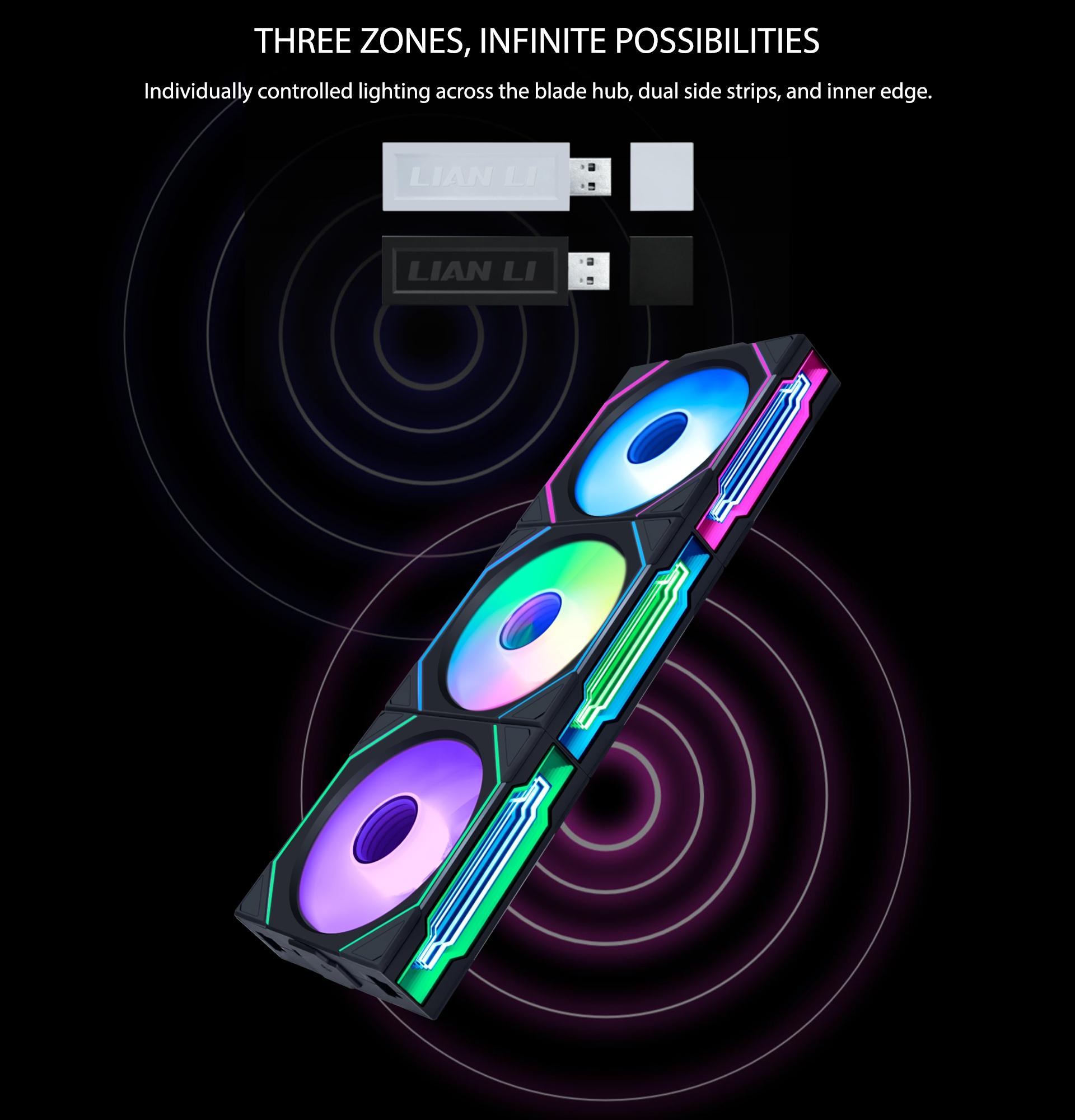 Effortless 2.4GHz wireless control for fan speeds and lighting across up to 10 Lian Li device groups—including SL-INF Wireless, HydroShift II AIOs, Strimer Wireless, and more.