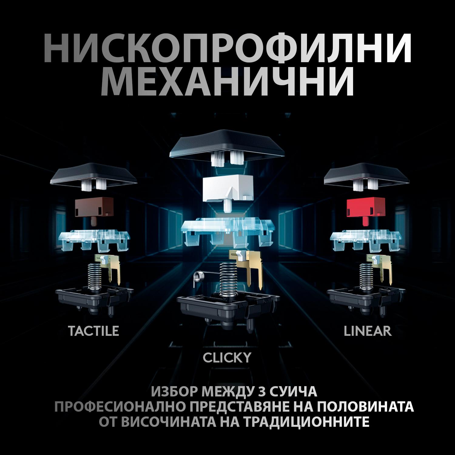 G915 TKL ви позволява да персонализирате всеки клавиш поотделно, с приблизителнo 16,8 М цвята. Създайте свои собствени анимации или изберете от предварително зададените ефекти. С LIGHTSYNC технологията осветлението може да се променя в зависимост от играта, която играете, музиката, която слушате или от съдържанието, което се показва на монитора ви, за да ви предложи най-потапящото RGB изживяване, което сте виждали (изисква инсталирането на Logitech G Hub).