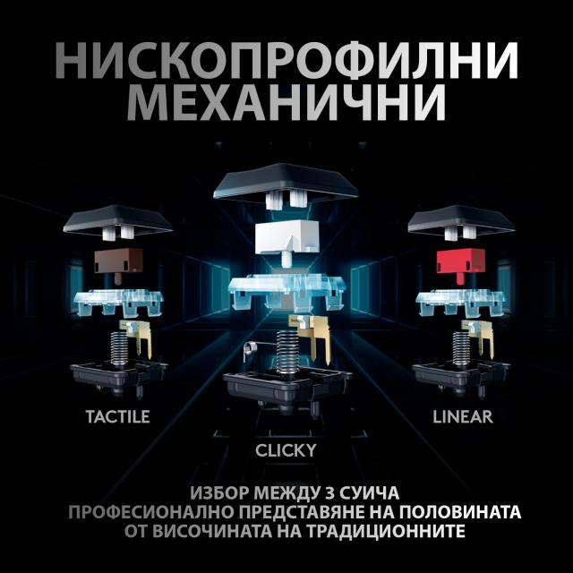 - Механичните превключватели с нисък профил предлагат скоростта, точността и производителността на механичен превключвател на половината височина. Превключвателят GL Clicky се отличава с отличителен звук и тактилна обратна връзка. Предлага