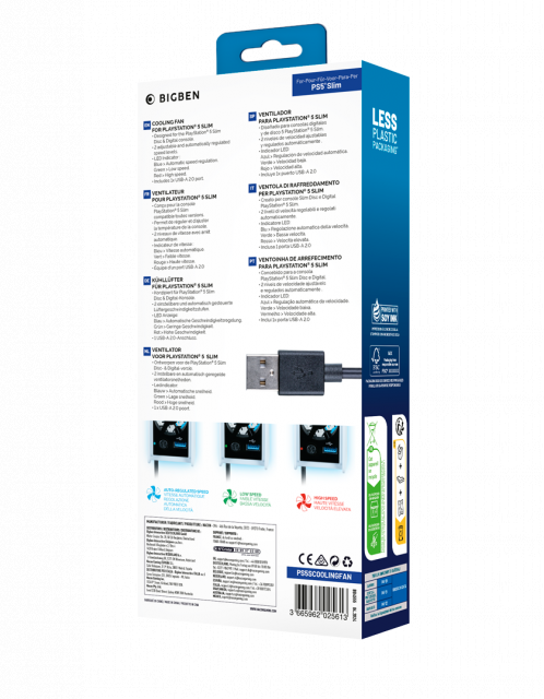 Вентилатор с температурен сензор за PS5 Slim конзола. Оборудван с вграден USB-A порт и сини светодиоди за динамичен светлинен ефект.