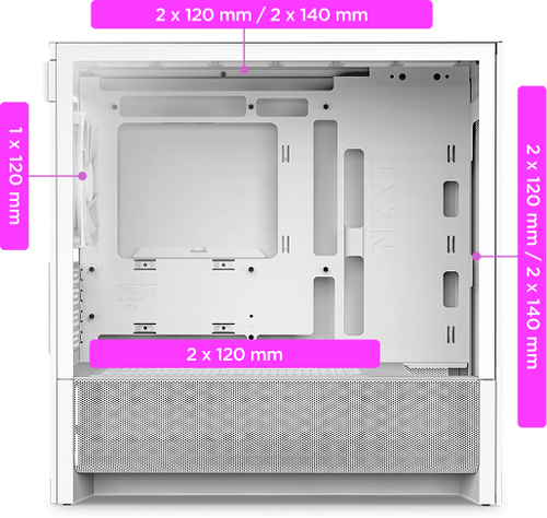 Supports up to 140 mm fans (two front, two top) and 120 mm fans (two bottom, one rear).