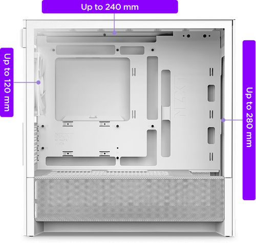 Supports a 280 mm front radiator and a 240 mm top radiator for versatile cooling setups.