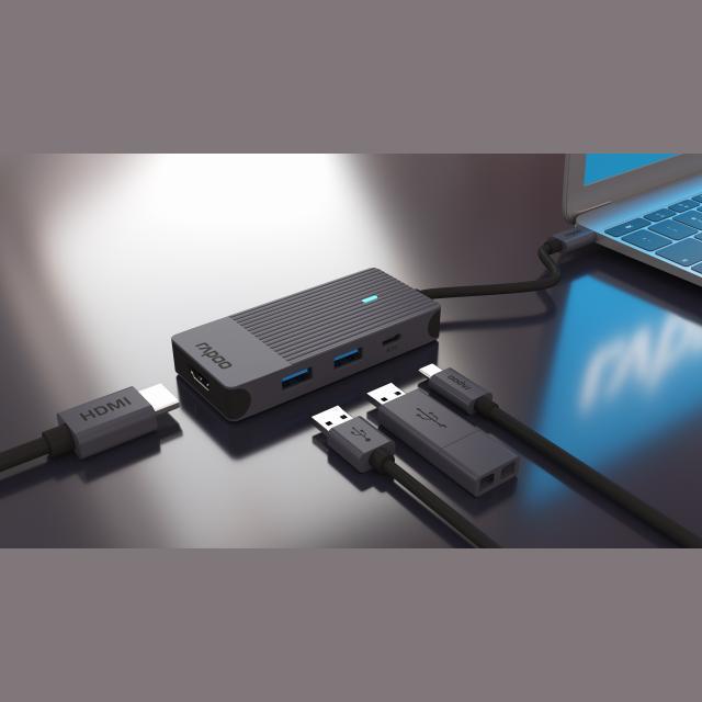 4-портов хъб Rapoo UCM-2001, 4 в1, 2 x USB-A, 1 x USB-C, 1 x HDMI, Черен