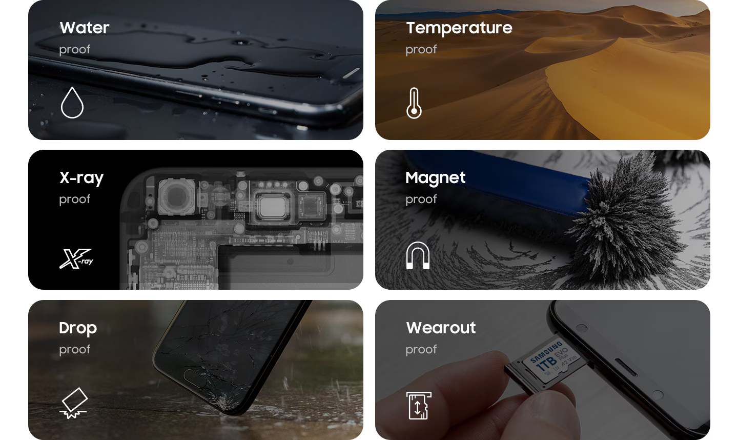 *Samsung не носи отговорност за каквито и да е щети и/или загуба на данни или разходи, възникнали при възстановяване на данни от карта с памет.¹Водоустойчивост: издържа до 72 часа в морска вода.²Температурна устойчивост: работни температури от -25 C до 85 C; неработни температури от -40 C до 85 C.³Устойчивост на рентгенови лъчи: до 100mGy, равняващо се на рентгеновите апарати на летище.⁴Магнитна устойчивост до 15 000 гауса или еквивалент на ЯМР с високо поле.⁵Падане : издържа на изпускане до 5 метра (16,4 фута)⁶Износване: до 10 000 плъзгания*Горните данни се основават на вътрешни тестове с microSD картата и не се отнасят за адаптера.