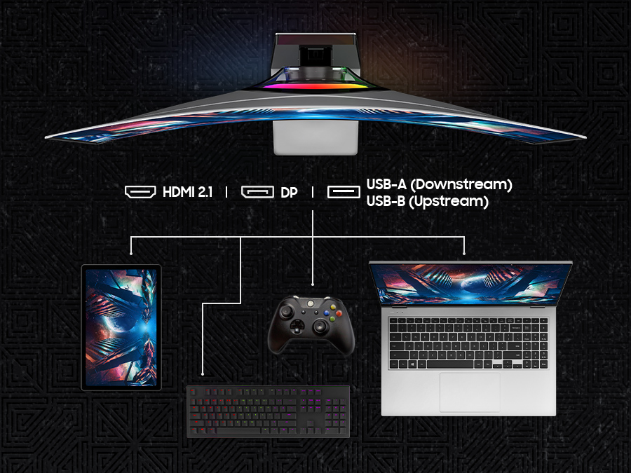 HDMI 2.1, DisplayPort, USB-A Downstream и USB-B Upstream портовете ти позволяват да се свържеш монитора с любими устройства, които подобряват твоето гейминг изживяване и ти спестяват досадната плетеница от кабели.