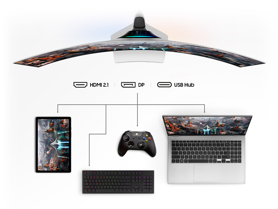 Tap into a multitude of input options. HDMI 2.1, DisplayPort and USB Hub let you hook up to favourite devices that elevate your game with no mess.