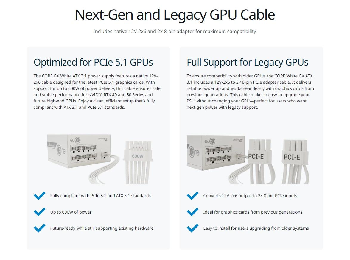 The updated Seasonic CORE GX White ATX 3.1 Series complies with the latest ATX 3.1 and PCIe 5.1 standards and includes four output ranges from 1000 W to 650 W in both black and white colors. Catering to a broad spectrum of PC enthusiasts and system builders, these power supplies provide a fine balance between cost and performance. The 80 PLUS Gold certified Seasonic’s Core GX White line is a fully modular design equipped with white cables featuring a braided pattern. These power supplies are solid performers for a large range of applications, where a 120 mm Hydro Dynamic Bearing fan is combined with Seasonic’s Smart and Silent Fan Control to ensure the optimal cooling performance at the lowest possible noise level. These quality power supplies are backed up by Sea Sonic’s 7-year worldwide manufacturer’s warranty.