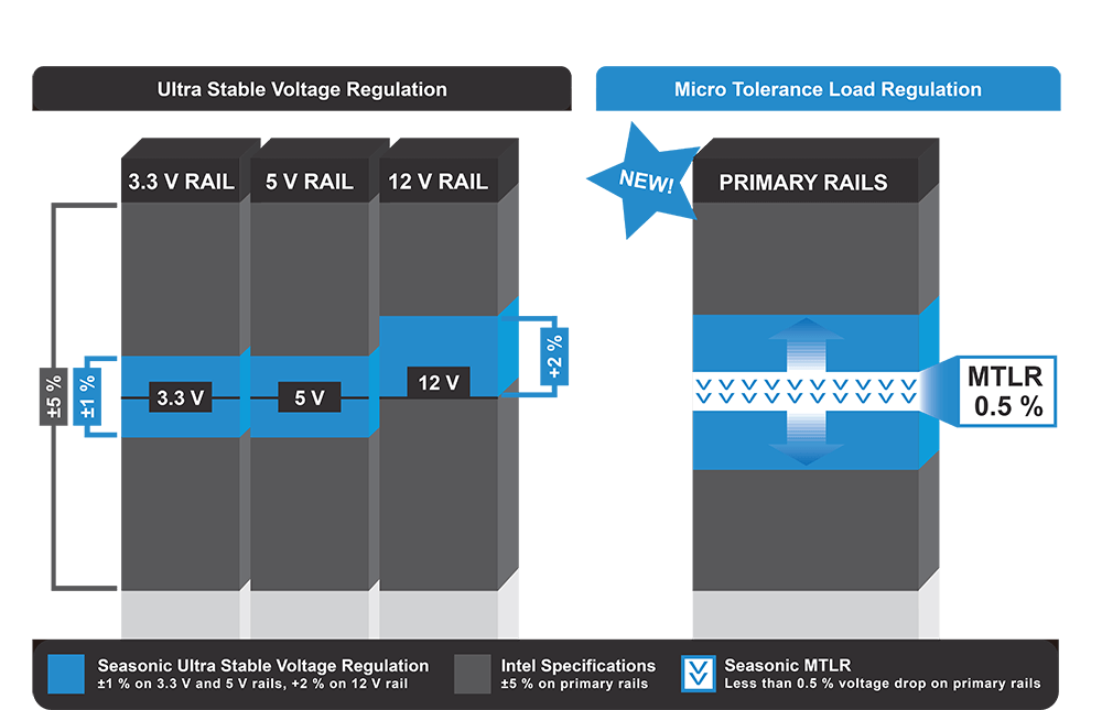 Seasonic’s latest design keeps the output voltage within a very tight range, achieving under 0.5 % load regulation. This impressive electrical performance and stability makes this power supply an ideal choice for high-performance systems.
