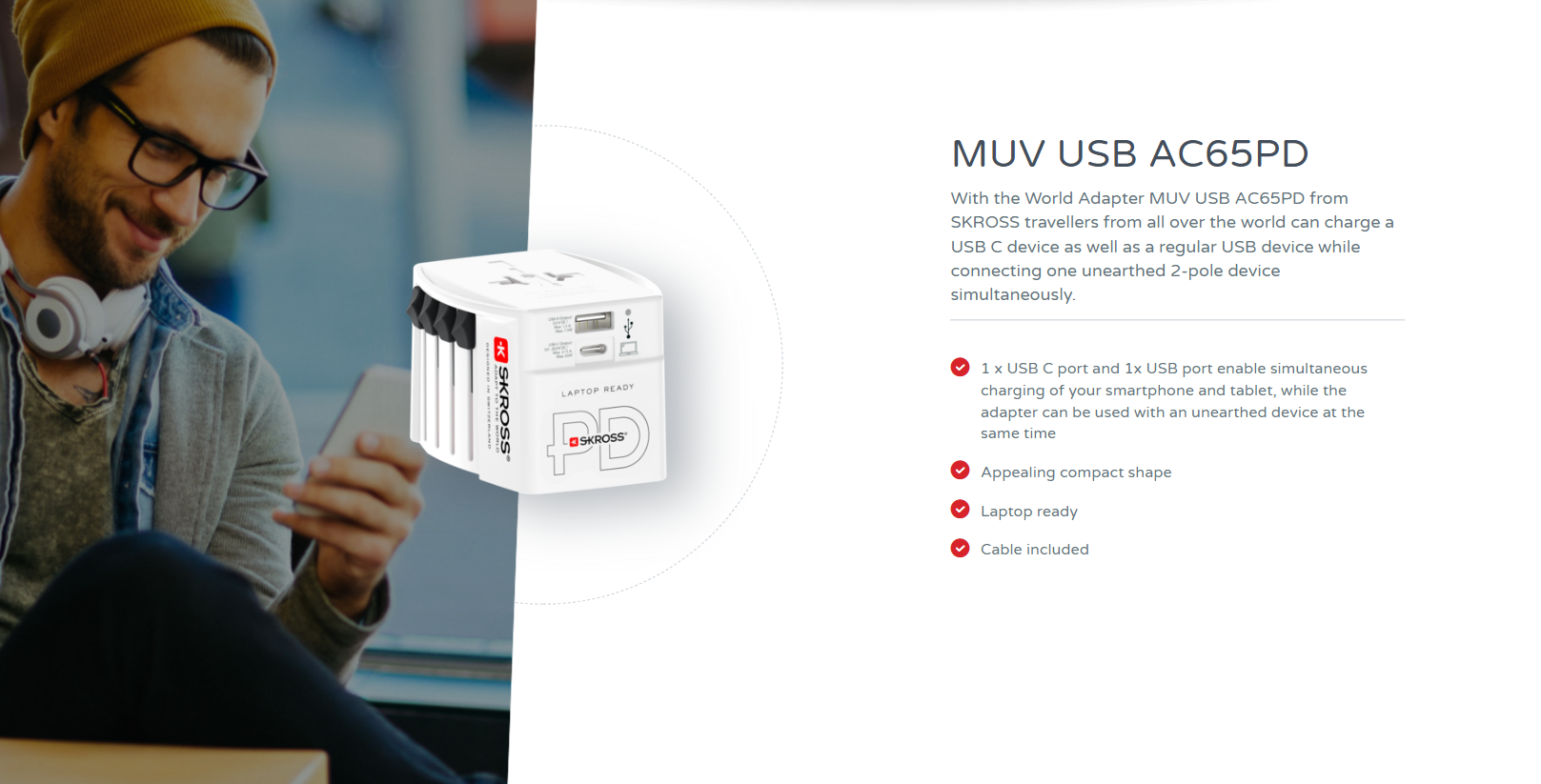 Адаптер SKROSS AC65PD, USB-A, USB-C, 1.302976, World, Бял