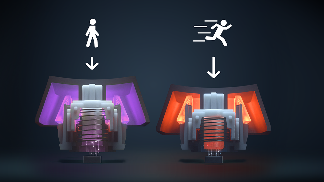 Програмирайте две действия за един бутон в зависимост от начина, по който го натискате. Вървете напред с леко натискане на клавиша, а след това спринтирайте, като натиснете същия бутон по-дълбоко. Създайте свои собствени творчески комбинации с помощта на SteelSeries Engine, за да победите конкуренцията.