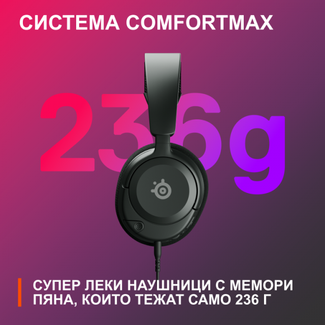 Изключително леки и тънки Изглеждат супер добре. Стилният корпус на Arctis Nova 1 е само 236 г, което ти осигурява комфорт при носене през целия ден. Изпъкни навсякъде благодарение на първокласния им висококачествен дизайн.
