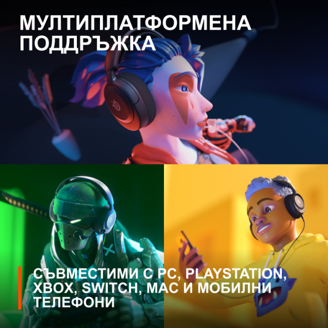 Качеството на Almighty Audio звука никога не е бил по-достъпно благодарение на Arctis Nova 1 - перфектно съчетание от хардуер и софтуер. Системата ще ти осигури превъзходно качество на звука, заради висококачествени драйвери, поглъщащ 360° пространствен звук и 10-лентов параметричен еквалайзер за множество настройки. Системата ComfortMax има 4 точки на регулиране, с които лесно ще настройш слушалките, и е с наушници от AirWeave мемори пяна, които прилягат перфектно. Мощни алгоритми с AI управляват микрофона с активно шумопотискане, за да изчисти фоновия шум - както случващото се около теб, така и от съотборниците ти в чата. Arctis Nova 1Р са с 3,5-милиметров жак, който работи с почти всяка платформа, включително PC, PlayStation, Xbox, Switch и мобилното ти устройство. Регулирай лесно силата на звука и заглушавай гласа си с помощта на бутоните за управление, които се намират на самите слушалки.