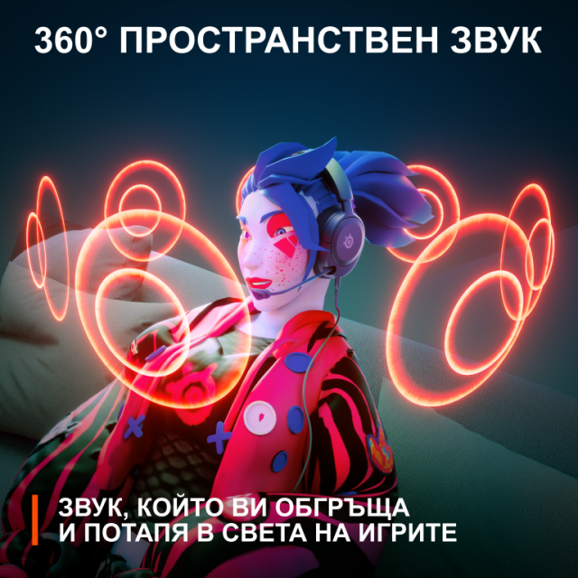- 360° Аудио пространство - Потапящият съраунд звук ви пренася в света на игрите, като ви позволява да чуете всяка критична стъпка, презареждане или глас, което да ви даде предимство. *Напълно съвместим с Tempest 3D Audio за PS5 / Microsoft Spatial Sound