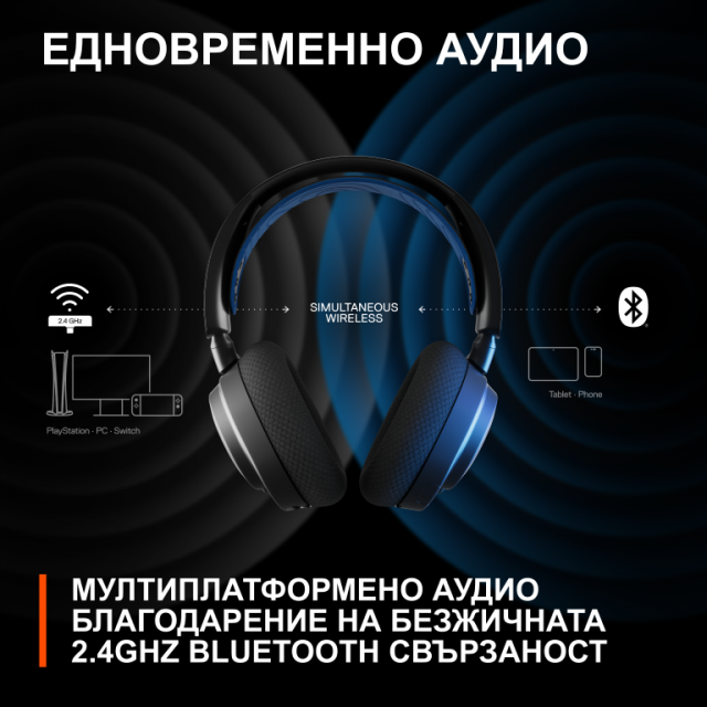 - Двойни аудиопотоци - Смесвайте две аудиовръзки едновременно, за да можете да разговаряте с приятели, докато играете. Играйте с 2,4GHz без забавяне и използвайте Bluetooth едновременно за обаждания, Discord, музика и подкасти.