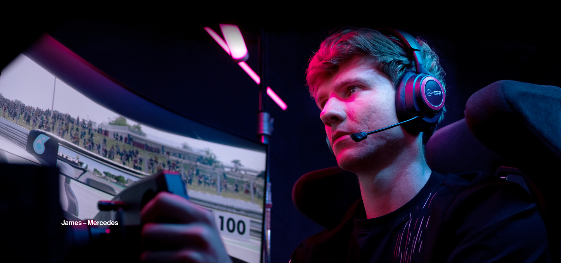 Faker (T1), Rain (FaZe), and James Baldwin (Mercedes-AMG PETRONAS) wear the