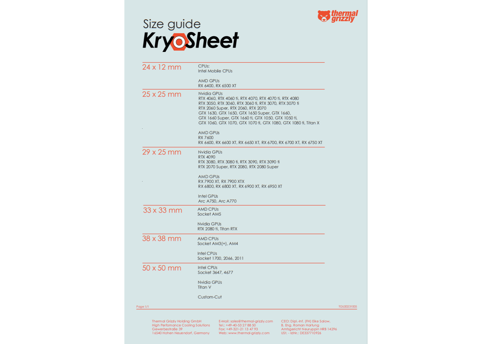 KryoSheet is available pre-assembled in various CPU/GPU standard sizes, e.g.: