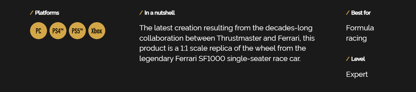 The Formula Wheel Add-On Ferrari SF1000 Edition is an incredibly versatile wheel, thanks to the ability to swap out its paddle shifters. For even smoother gear shifting (bounce time of less than 5 milliseconds), the T-Chrono Paddles paddle shifters (sold separately) are a must-have accessory for amazing lap times.