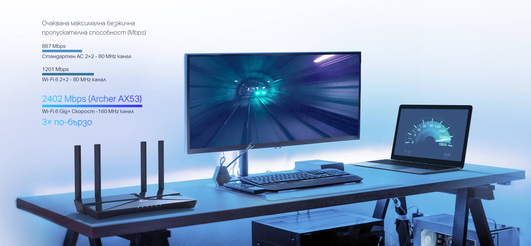 предоставя. С 160 MHz честотна лента и 1024-QAM, Archer AX53 осигурява истински гигабитови скорости до 3 Gbps. Насладете се на по-
