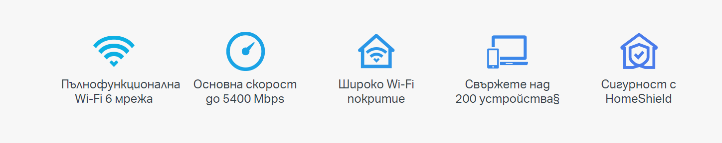 | Network Security | SPI защитна стена Контрол на достъпа IP и MAC обвързване Шлюз на слоя за приложения HomeShield сигурност IoT защита в реално време Блокиране на злонамерен сайт Система за предотвратяване на проникване Предотвратяване на DDoS атаки Скенер за домашна мрежа |
