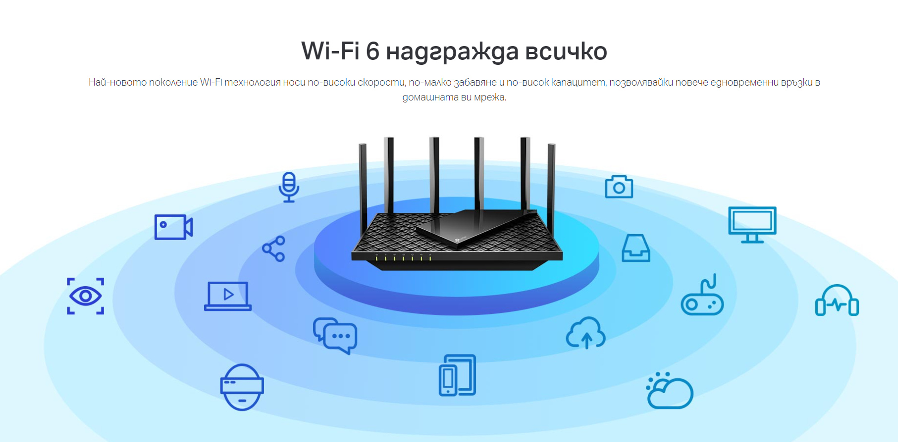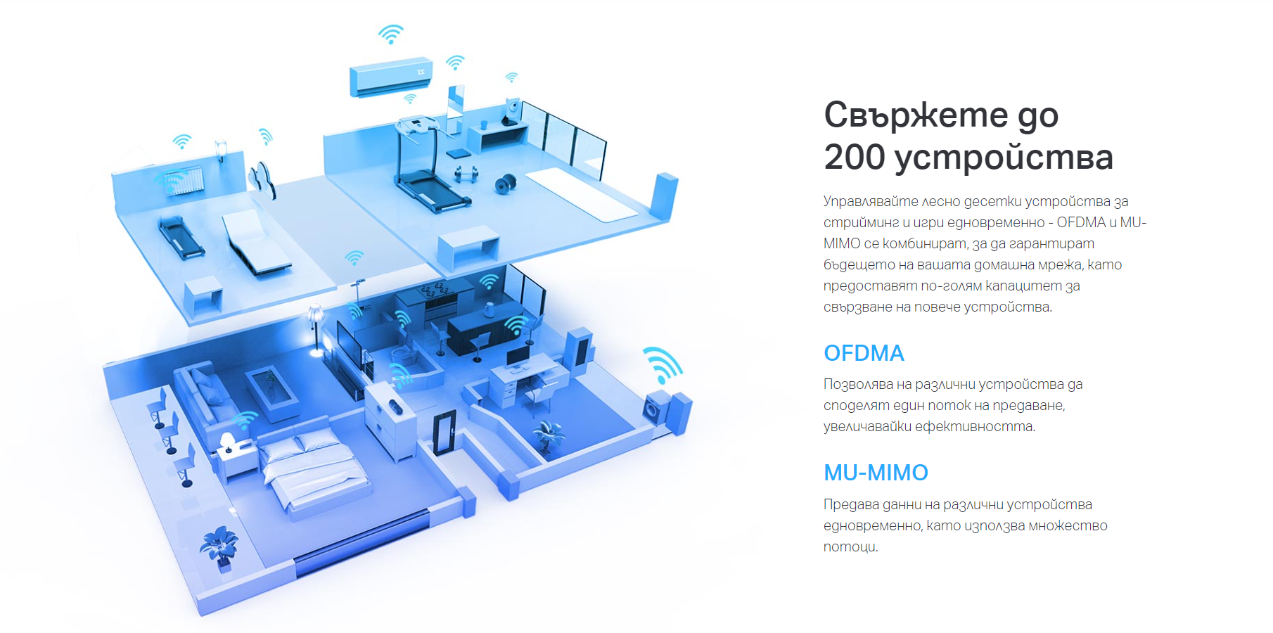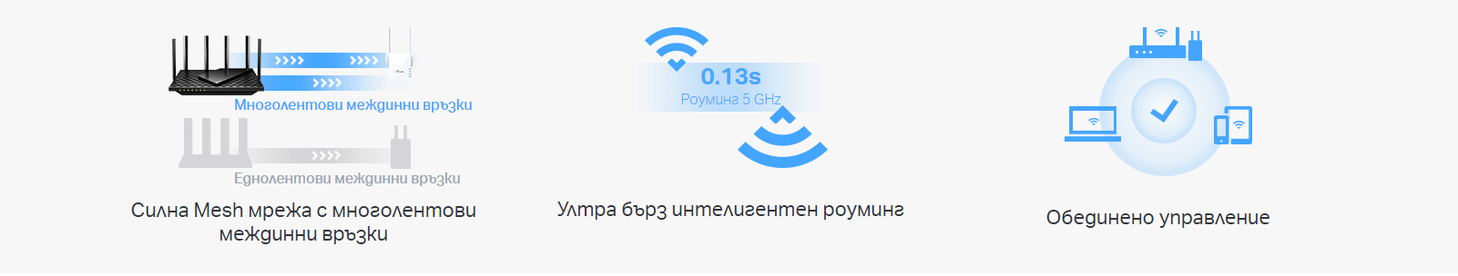 | OneMesh | Поддържа се OneMesh Без да замества съществуващите ви устройства и без да се налага да купувате изцяло нова WiFi екосистема, OneMesh ви помага да създадете по-гъвкава мрежа, която покрива целия дом с продуктите TP-Link OneMesh |