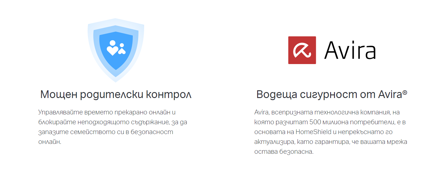 | Parental Controls | HomeShield Родителски контрол Персонализирани профили Библиотека с филтри за професионално съдържание Време за семейството Време за сън Време за изключване Награди с време К,ласиране на времето онлайн за семейството Поставете на пауза интернет Седмични и месечни отчети |