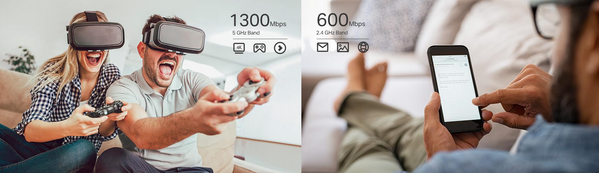 Archer C80 осигурява високоефективна и достъпна домашна Wi-Fi мрежа с обща скорост до 1900 Mbps. За прости задачи като изпращане на електронна поща или уеб сърфиране е подходяща 2.4 GHz-овата честотна лента, а за задачи с висок интензитет, като онлайн игри или 4K / 8K UHD стрийминг- 5 GHz-овата честотна лента ще се справи безупречно и без забавяне.