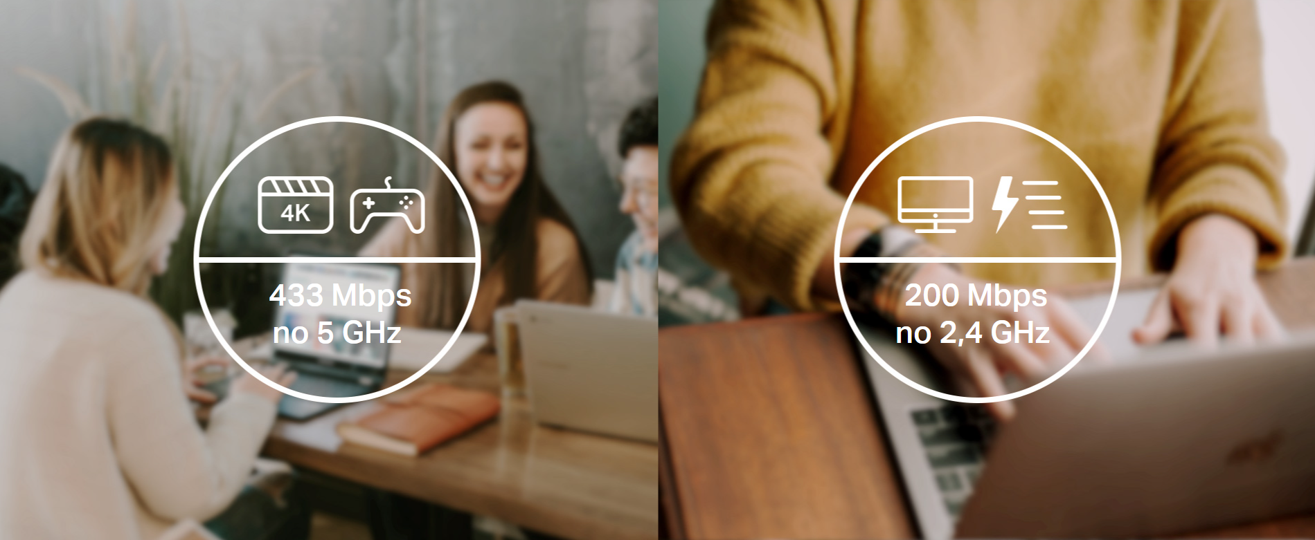 трансфер на данните по 2,4 GHz лента от 150 Mbps на 200 Mbps за 33% по-голяма бързина. 433 Mbps по 5 GHz лента е идеална скорост за