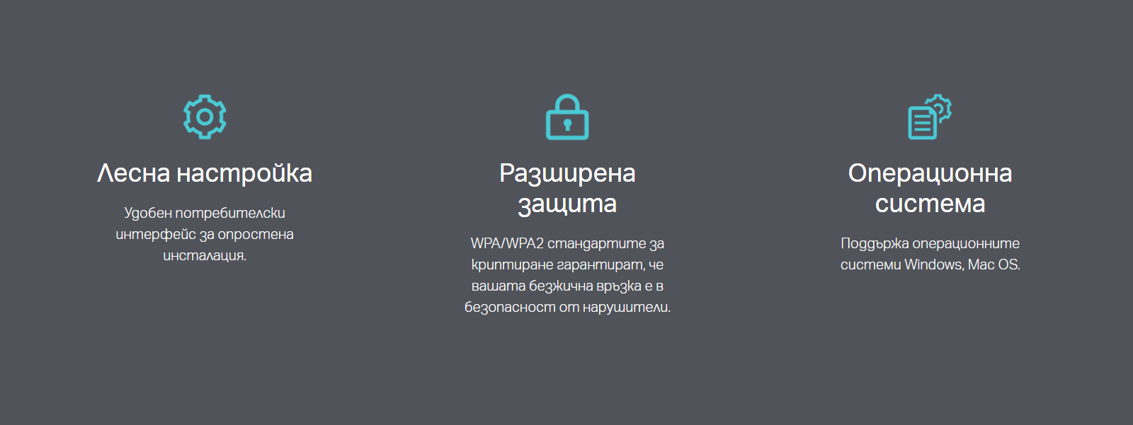 - Разширена защита – поддържа 64/128-битови WEP, WPA/WPA2 и WPA-PSK/WPA2-PSK стандарти за криптиране