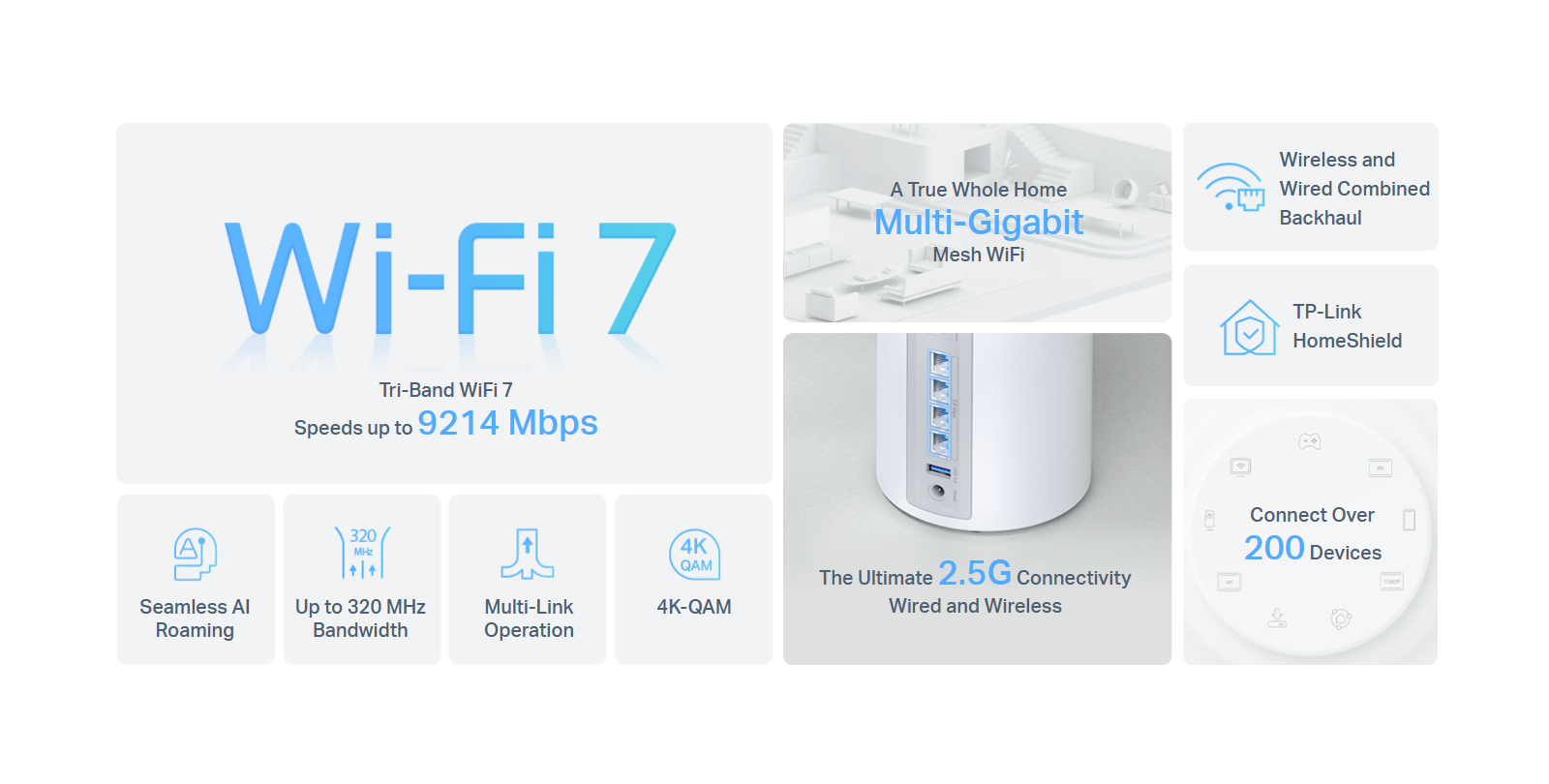 | Advanced Functions | • Multi-Link Operation (MLO) • 320 MHz Channel • 4K-QAM • Multi-RUs • Works with Alexa and Google Assistant |