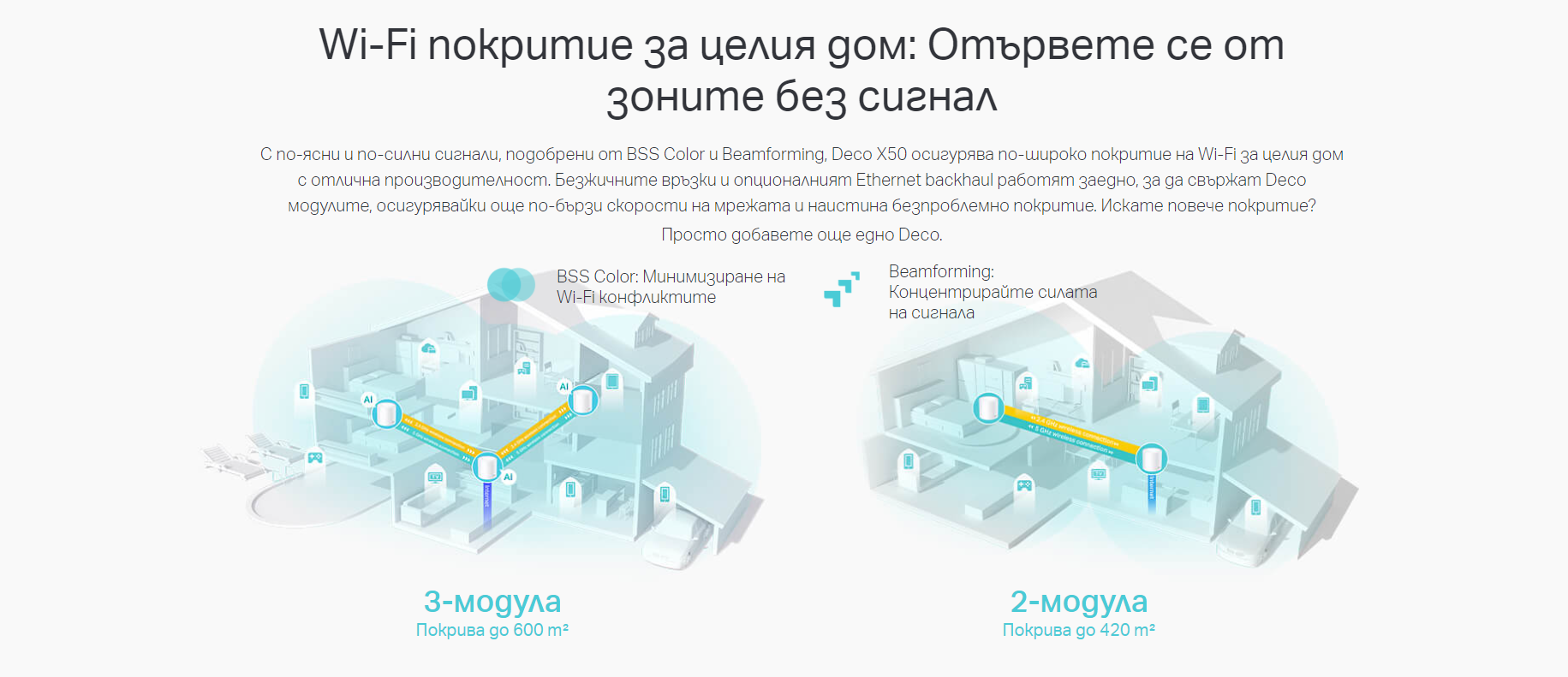 | WiFi Range | Къщи с 4-6+ спални (3 модула) TP-Link Mesh технология Optional Ethernet backhaul работи заедно за свързване на Deco модулите, за да осигури безпроблемно покритие AI-Driven Mesh Интелигентно разучава мрежовата среда, за да осигури идеален Wi-Fi, уникален за вашия дом 2× антени (вътрешни) Множество антени образуват масив за усилване на сигнала, за да покрият повече посоки и големи площи Beamforming Концентрира силата на безжичния сигнал към клиентите, за да разшири обхвата на Wi-Fi |
