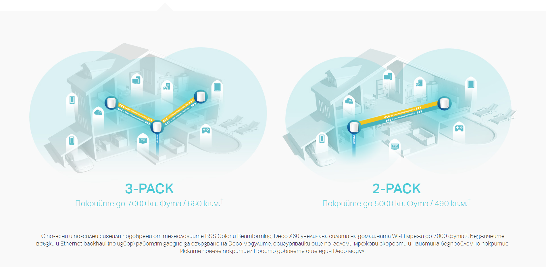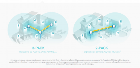 | WiFi Range | 3-5 Bedroom Houses (2-pack) TP-Link Mesh Technology Optional Ethernet backhaul work together to link Deco units to provide seamless coverage 4× Antennas (Internal) Multiple antennas form a signal-boosting array to cover more directions and large areas |