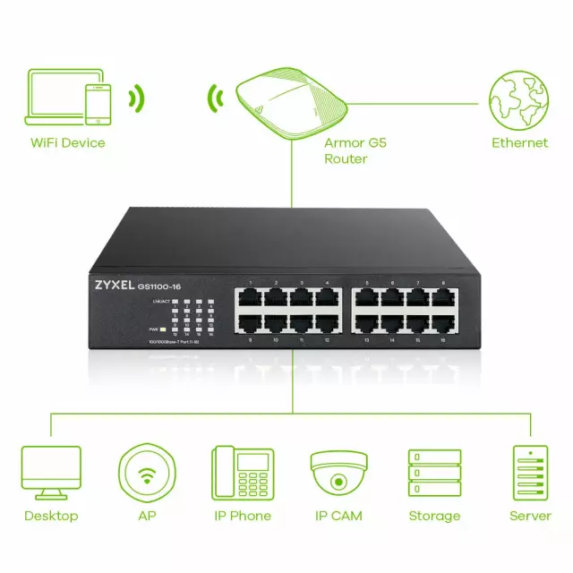 Сериите суичове ZyXEL GS1100 са най-доброто решение за мигновена гигабитова свързаност в офисната среда, изискваща тиха работа и висока енергоефективност. С функциите за спестяване на електроенергия, гигабитовата скорост и безвентилатония дизайн, сериите GS1100 осигуряват plug-and-play опростено функционалност за високонатоварващи мрежови приложения.